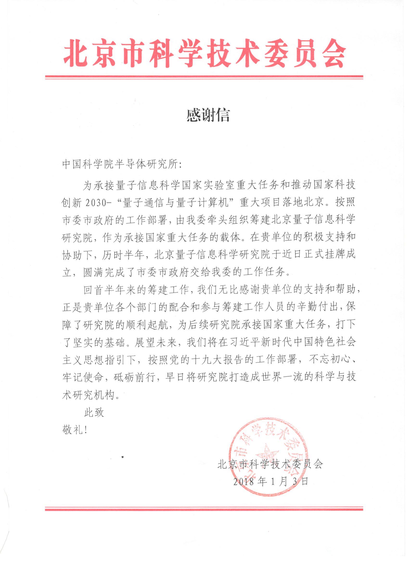 - 转发关于我所积极参与北京量子信息科学研究院工作的感谢信2018-01-10