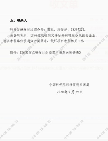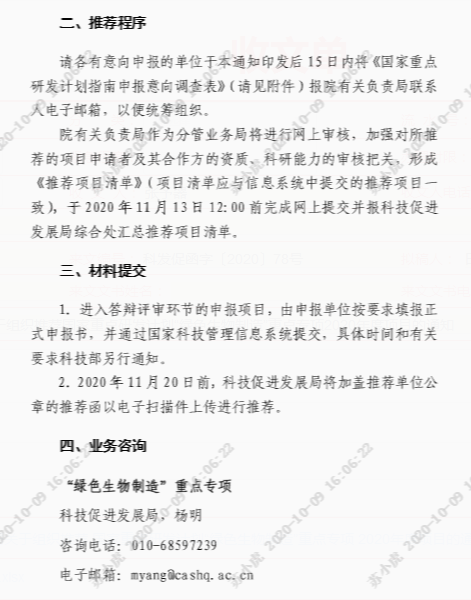 附件是院关于组织推荐国家重点研发计划“绿色生物制造”重点专项2020年度项目的通知,请各有意向申报的人员在10月16日之前填报附件申报意向调查表,以便统筹组织,过时不候。