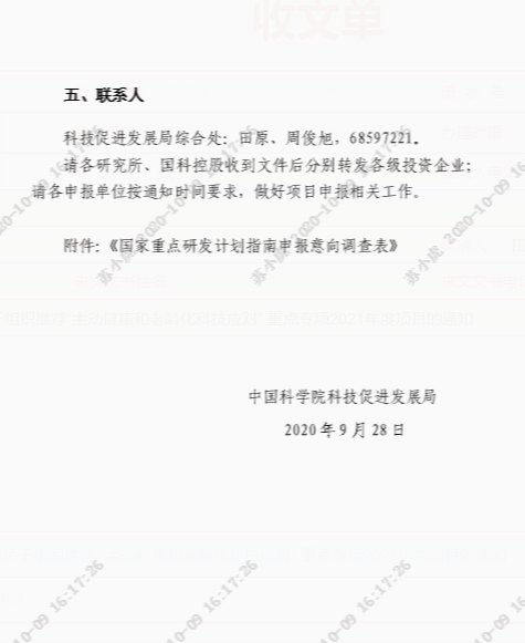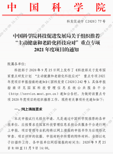 附件是院关于组织推荐国家重点研发计划“主动健康和老龄化科技应对”重点专项2020年度项目的通知,请各有意向申报的人员在10月16日之前填报附件申报意向调查表,以便统筹组织,过时不候。