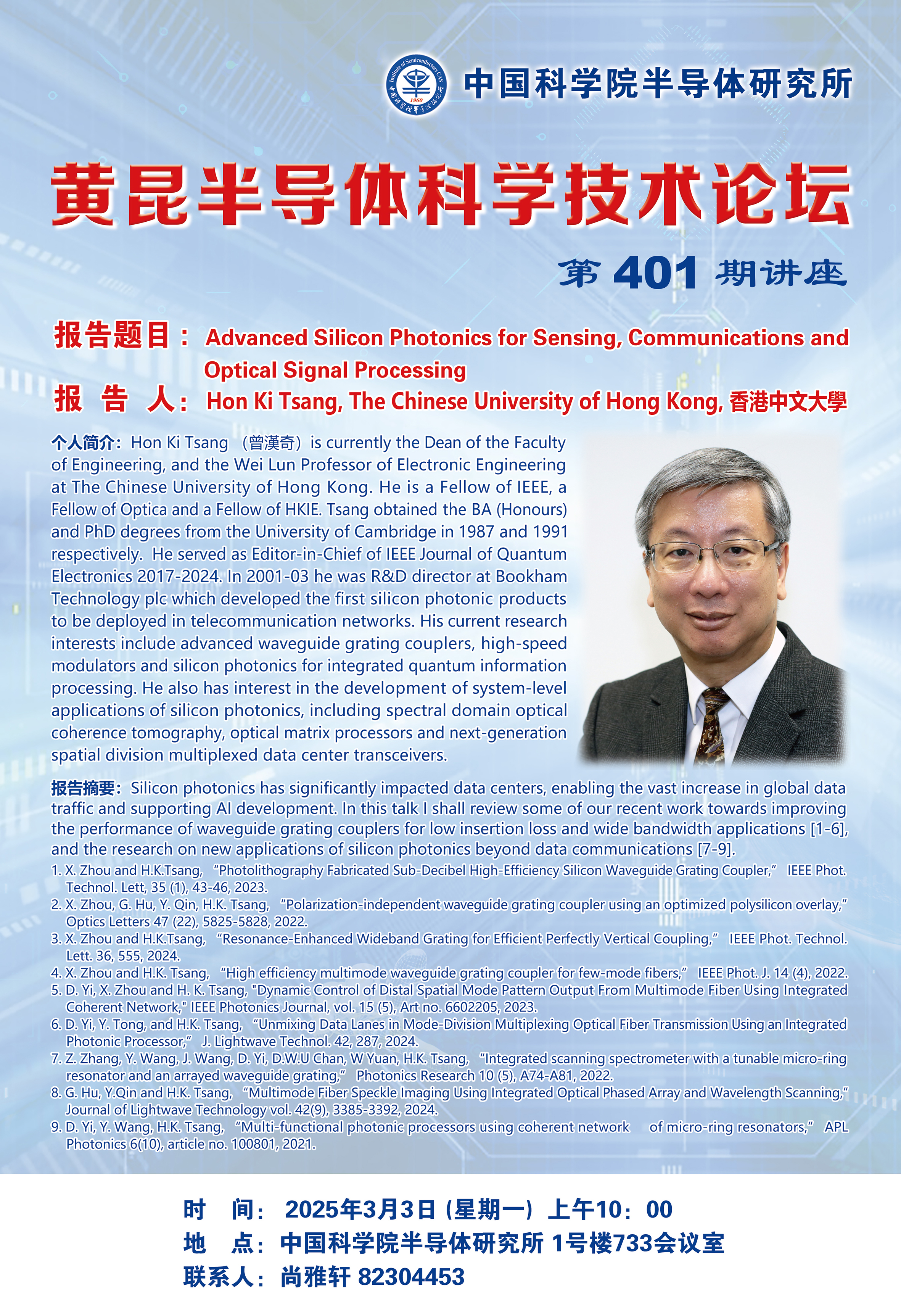 Hon Ki Tsang教授将于2025年3月3日来所交流并在黄昆半导体科学技术论坛上作第401期报告