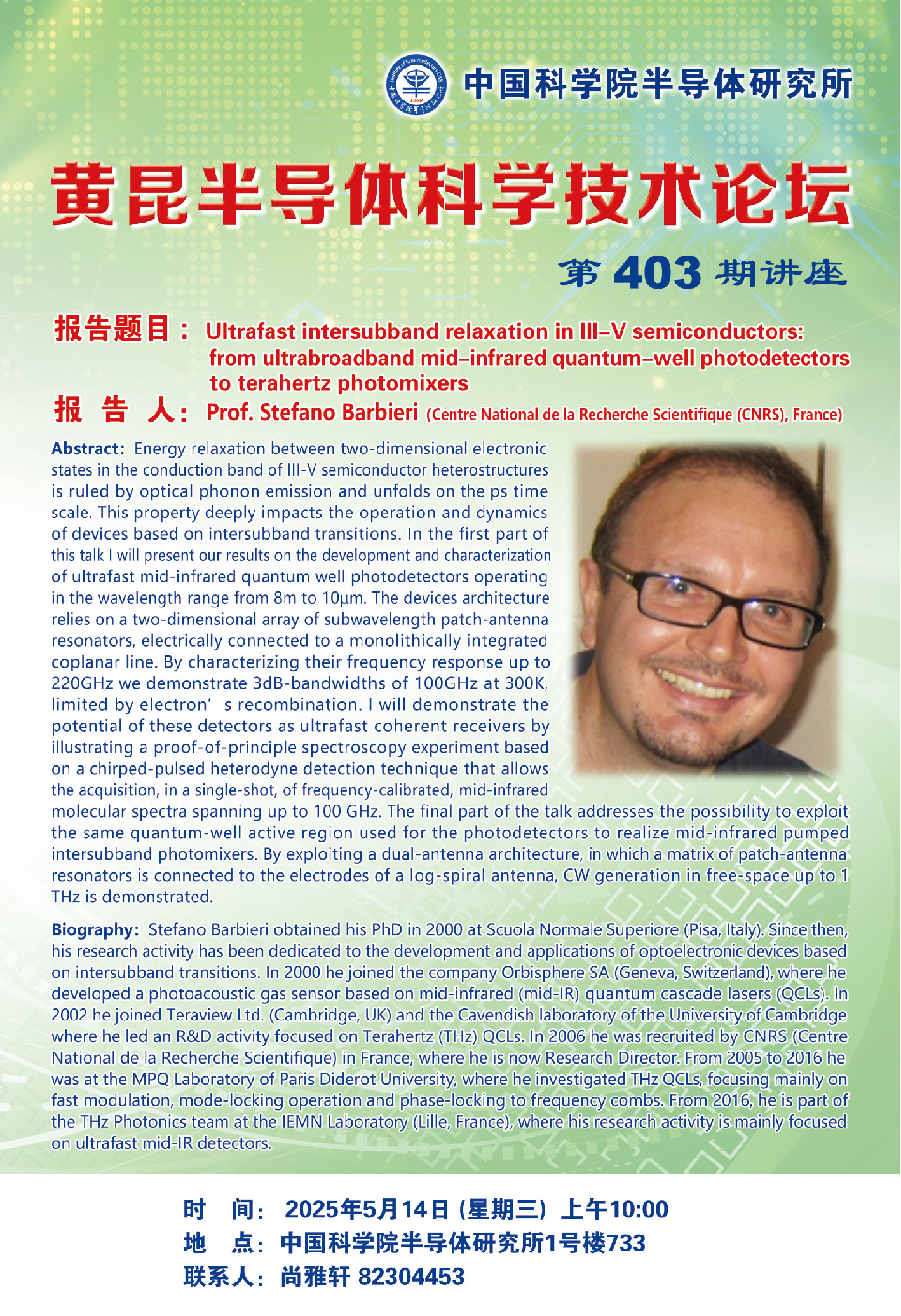 Stefano Barbieri教授将于2025年5月14日来所交流并在黄昆半导体科学技术论坛上作第403期报告
