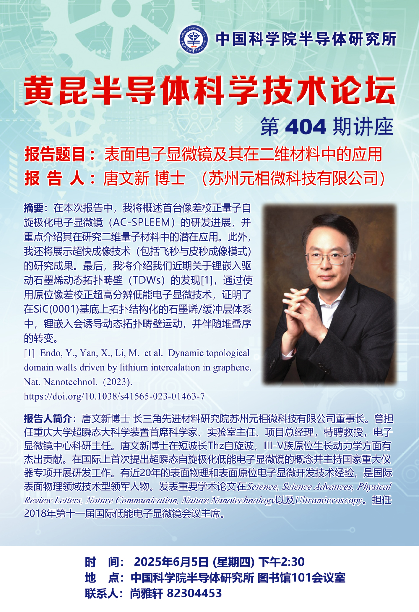 唐文新博士将于2025年6月5日来所交流并在黄昆半导体科学技术论坛上作第404期报告