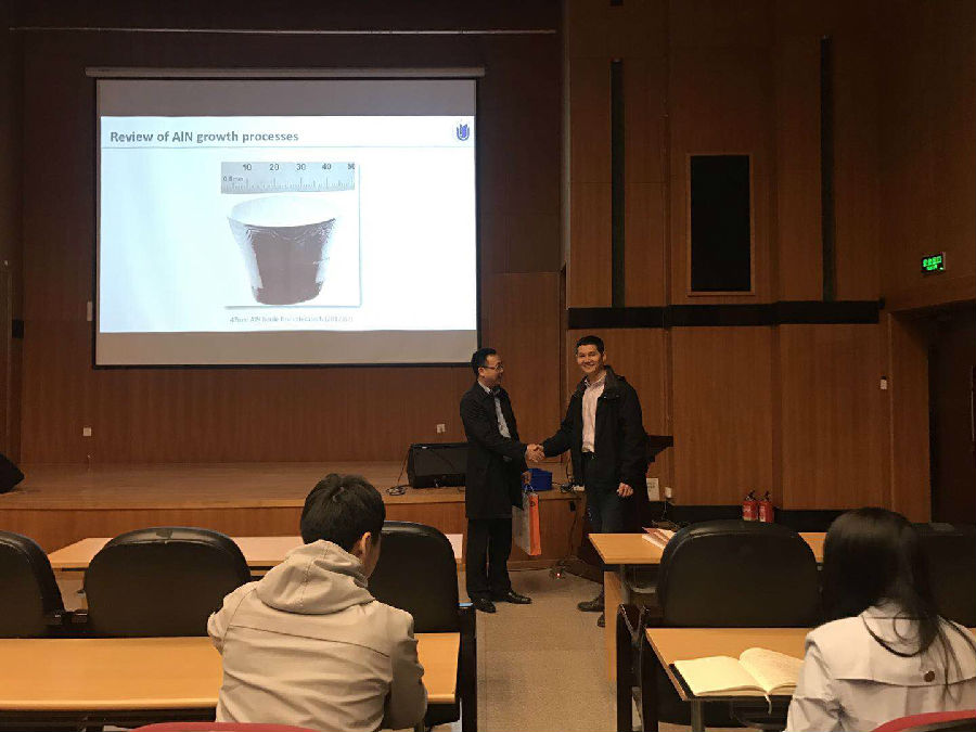 交流会上,吴亮教授作了题为Novel Approach to Grow High-Quality and Large-sizeFreestanding AlN Single Crystals by PVT Method的学术报告,系统地介绍了采用PVT生长AlN单晶的方法,对AlN单晶材料的研究背景、意义、前景及方法进行了精辟的阐述,发表了自己独到的见解,并与在座的30余名博士和硕士研究生进行了热烈的讨论和交流,使大家受益匪浅。