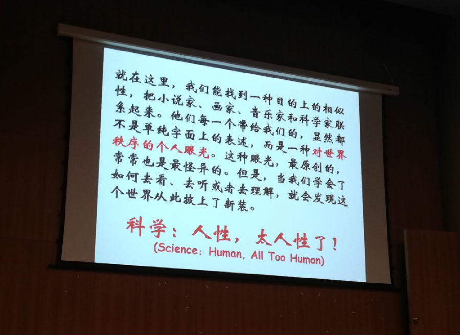 金老师的报告题目为“科学:人性,太人性了!”。报告从人类学、古希腊和现代西方文明史、人文和艺术比较的视角出发,阐明了科学和人文的关系。他特别强调科学不是纯粹逻辑和理性对客观世界的机械描述,而是与文学、艺术和音乐等一起,构成了人类创造物的精华。他旁征博引,从浩如烟海的原始文献中凝练出了近十个物理学史上的经典案例,论述了这些重大的科学发现是麦克斯韦、普朗克、爱因斯坦等物理大师们富有创造力和想象力的作品,充满了物理先贤们的人性光辉。这些伟大的科学发现与莫奈的画、莎士比亚的戏剧、巴赫的音乐一样,都包含着人性的光芒并带给我们快乐,这也是为什么即使不从事科学事业的人,仍然需要学习科学的原因。