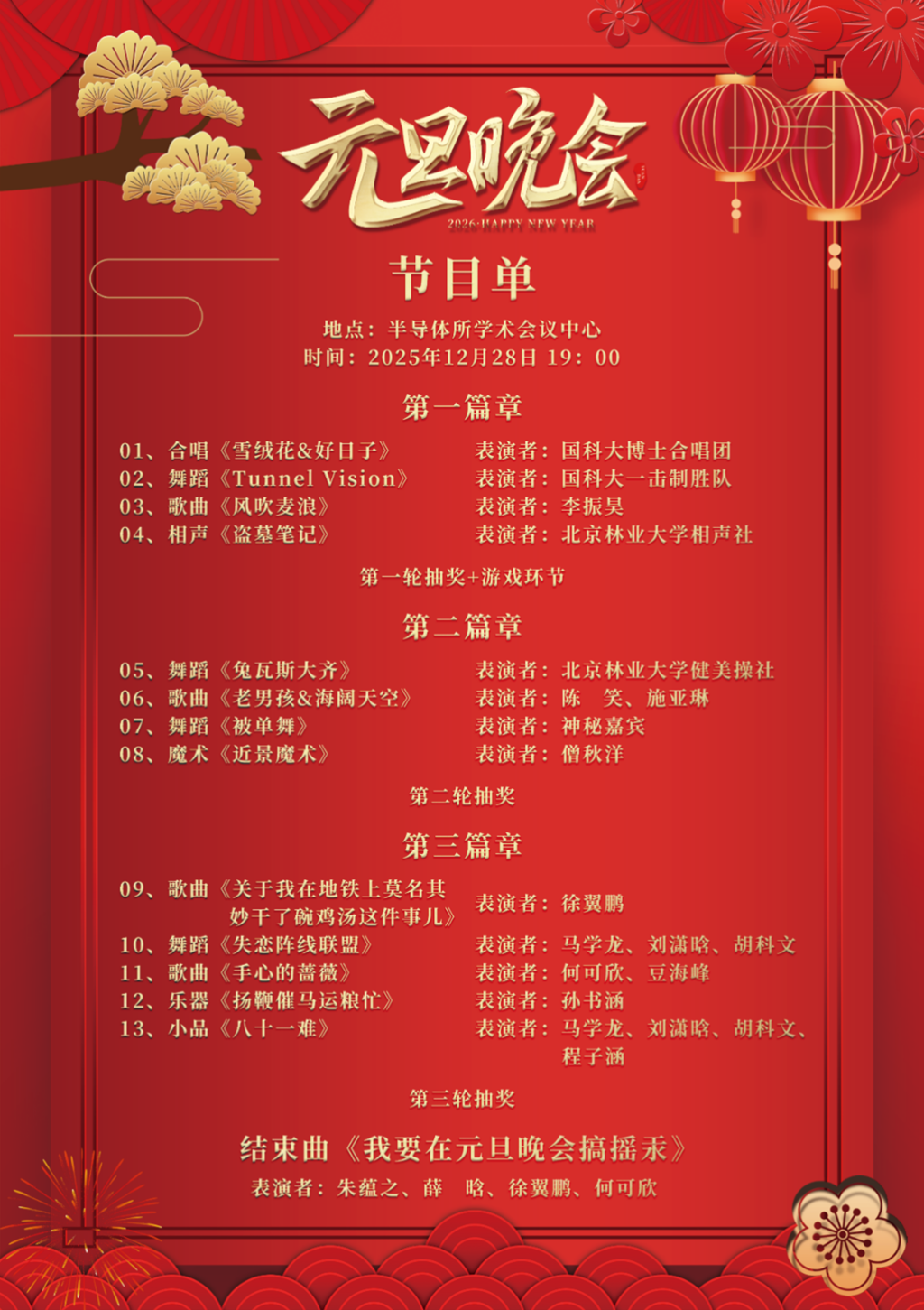 这不仅是一场晚会,更是一次温暖的相聚,一段共同的记忆。让我们用欢笑与掌声,告别过往,拥抱即将绽放的2026,在这辞旧迎新的美好时刻,我们向半导体所全体师生致以诚挚的新年问候,祝愿大家身体健康、阖家幸福、新年快乐!期待与您,共赴此时!让我们28日晚,不见不散!