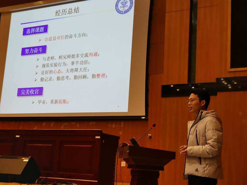 首先,刘香全师兄分享了他的科研经历,着重从时间和方法两个方面讲述了他的实验经验。当提到努力奋斗的方法时,他着重强调了规范实验的重要性以及四个“勤”——勤记录,勤思考,勤回顾,勤整理。刘香全师兄不仅看重实验过程的精确规范,还着重强调了实验后记录总结的过程,他提到在整理记录过程中发现了一些细小的规律,进行回顾思考后发表了论文。