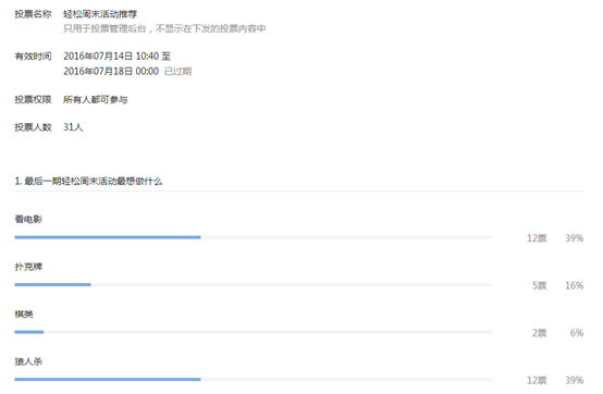 我们这学期的“轻松周末”活动随着高温假的临近,迎来了最后一期。之前举办的“轻松周末”活动主要以电影和棋牌为主,为了跟大家更好的交流沟通,我们在微信公众平台上进行了投票活动,邀请大家推选最后一期的主题。相关投票结果如下: