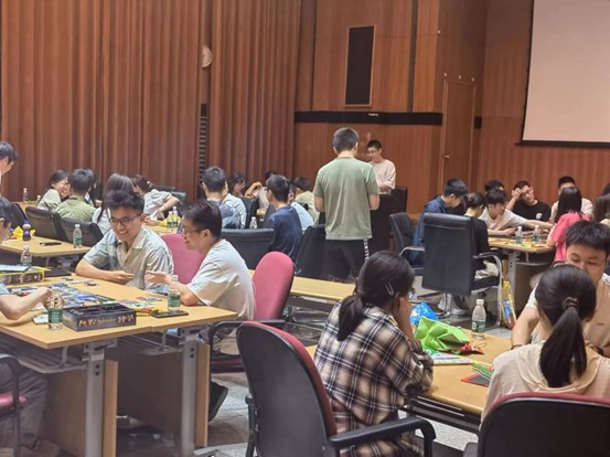 夜幕降临,学术会议中心灯火通明,气氛温馨而热烈。来参加活动的同学们热情高涨。他们在宽敞的大厅中分成若干小组,围坐在桌旁,开始了各种有趣的棋牌桌游活动。