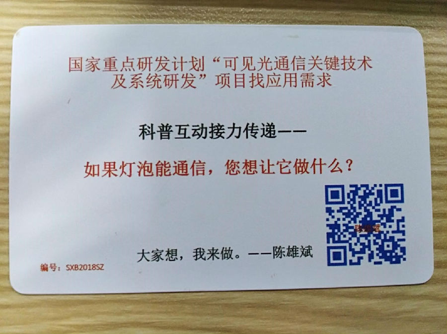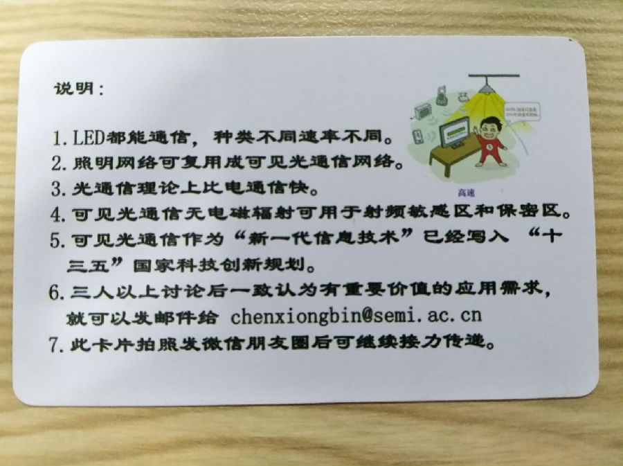 活动开始前陈老师向在场同学发放了可见光通信科普卡片,从半导体照明的过去、现状和未来讲起,半导体照明由技术突破带来了产业革命,在过去十年经历了从代替照明到按需照明的转化,2008年路甬祥院长批示可见光通信可能是无线领域从电磁走向光传输的很好切入点,通信是人类的基本需求。