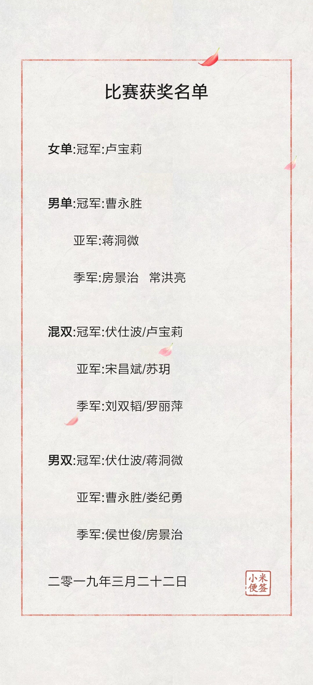 本次比赛在各位参赛同学、老师的配合下得以圆满完成,大家以羽毛球会友,本着“友谊第一,比赛第二”的原则,整个比赛过程非常和睦,无冲突、无意外受伤。同时,这次比赛的成功举办离不开研究生部老师的支持,也得益于整个研究生会的互帮互助。研会体育部为本次活动的主办方,我们将继续努力,不断完善活动的细节,争取为大家筹办一次次精彩的体育活动。下一个春暖花开的季节,我们羽毛球场再会!
