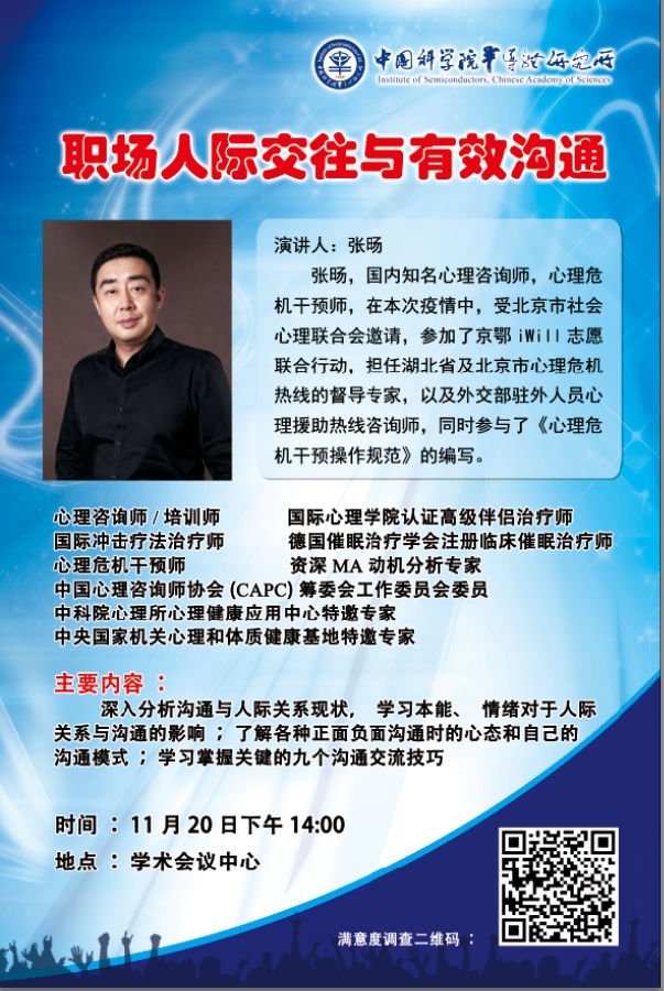 人际的有效沟通直接影响到工作的效率,如何与领导、同事进行有效沟通,是每个人必须面临的问题。为增强职工在职场沟通上的自信,所工会特申请参加了中科院工会职工心理健康服务中心巡讲活动,聘请心理学专家张旸开展“职场人际交往与有效沟通”心理讲座。讲座内容包括深入分析沟通与人际关系现状,学习本能、情绪对于人际关系与沟通的影响;了解各种正面负面沟通时的心态和自己的沟通模式;学习掌握关键的九个沟通交流技巧。诚邀广大职工、学生前来参加!