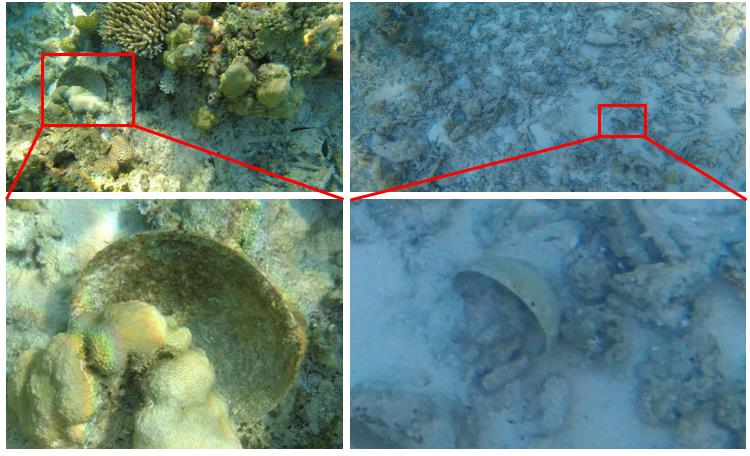 除珊瑚及鱼类等生物要素外,本次海试中,在海底还发现了生物附着的碗和盘子各一只(图4)。