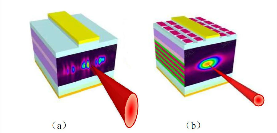 图1 (a)和(b)分别为现代半导体激光器和光子晶体激光器结构和输出示意图