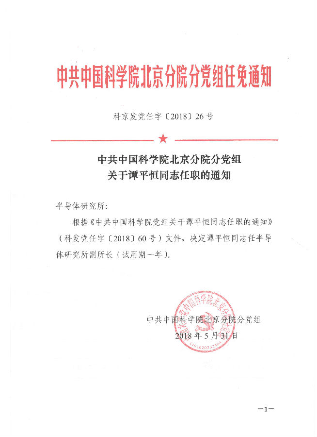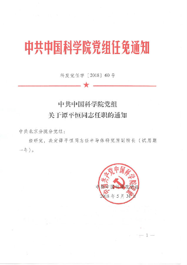 6月27日上午,副所长(法定代表人)祝宁华宣布了中共中国科学院党组、北京分院分党组的任免通知:经研究,决定谭平恒同志任半导体研究所副所长(试用期一年)。