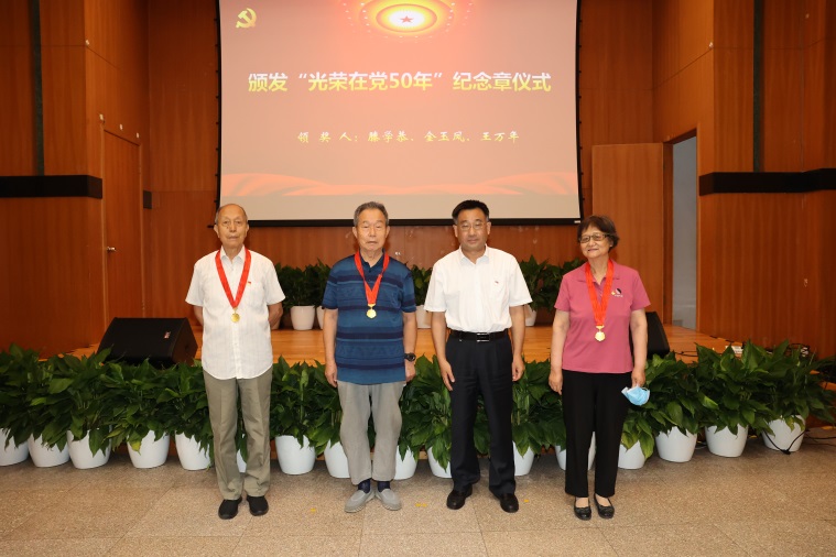 会上举行了“光荣在党50年”纪念章颁发仪式。冯仁国向滕学恭、金玉凤、王万年3位老同志颁发纪念奖章。“光荣在党50年”纪念章是对不忘初心、牢记使命的坚守,老同志是历史的亲历者、参与者、带头者和见证者,他们用实际行动践行了入党誓言,为半导体所的发展贡献了力量。