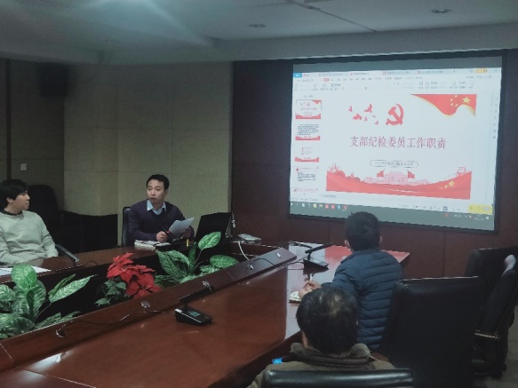 第二项议程是纪检委员王雷做“支部纪检委员工作职责”的报告。他结合《党支部书记及委员工作实用手册》的学习心得,讲解了严明党的政治纪律和政治规矩的重要性,并从纪检角度阐述了落实“双提升”计划的思考。