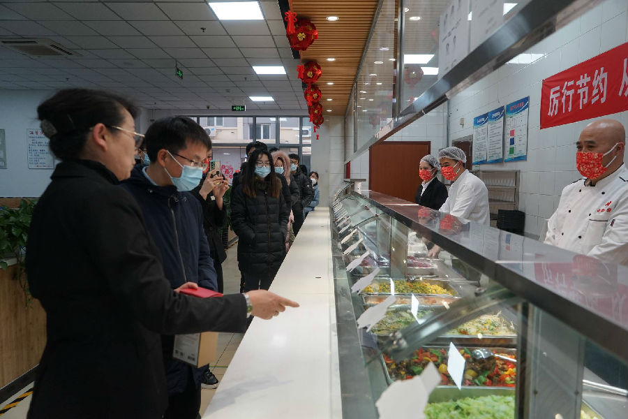所食堂经理段书梅向谭平恒汇报了除夕晚餐菜肴品种以及春节期间所食堂供餐准备情况。谭平恒详细询问了食堂原材料进货渠道、价格以及环境卫生等情况,强调做好食品卫生安全工作,做好环境定期消杀,确保春节期间供餐正常进行。
