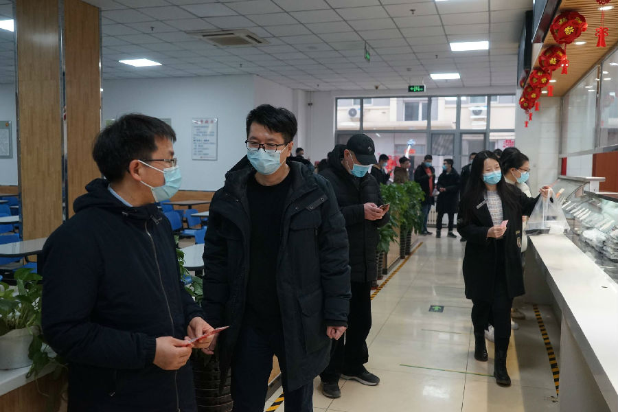 晚餐开始后,前来取餐的职工、研究生见谭所长亲临,纷纷鼓掌,谭平恒向大家挥手致意。谭平恒指出,大家积极响应党中央、中科院号召留京过年,减少人员流动,为疫情防控做出了贡献。谭平恒强调,现在疫情防控的形势依然严峻复杂,春节期间大家要绷紧疫情防控这根弦,做好个人防护,减少人员聚集,预祝大家度过一个温暖、祥和、健康的新春佳节。