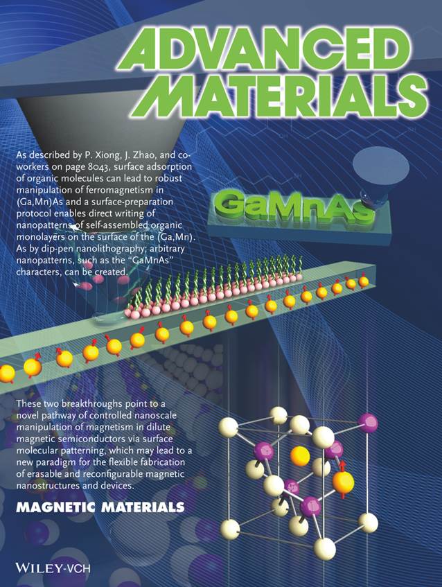 半导体所半导体超晶格国家重点实验室赵建华团队及合作者美国佛罗里达州立大学熊鹏教授等在有机自组装分子单层对磁性半导体(Ga,Mn)As薄膜磁性调控研究方面取得重要进展,相关成果发表在Advanced Materials (2015,27,8043–8050,DOI: 10.1002/adma.201503547)上,并被编辑选作期刊卷首(DOI: 10.1002/adma.201570332)。