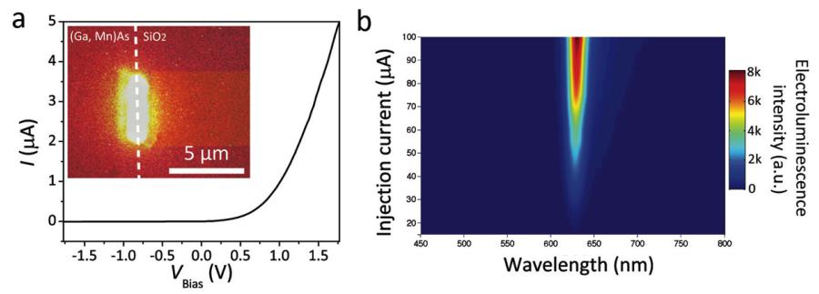 图2 (a) 单层WS2/(Ga,Mn)As异质结构的I-V特性曲线和发光图像;(b)自旋极化的电致发光强度与注入电流和发光波长的关系图。