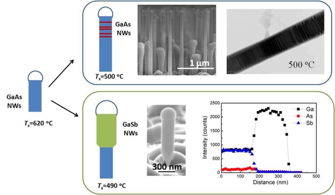 我所半导体超晶格国家重点实验室赵建华研究员团队近年来一直致力于半导体低维材料的分子束外延生长,最近其团队俞学哲博士等人在他们前期工作(X.Z. Yu et al.,Nano Lett.12, 5436, 2012; Nano Lett. 13, 1572, 2013)基础上,利用两步生长方法有效扩大了Si衬底上GaAs纳米线的生长温度范围。这是在相关工作中第一次关于Ga催化GaAs纳米线的生长温度这一重要晶体生长参数的深度研究,而之前由于一步生长法的限制,GaAs纳米线只能生长在一个很窄的温度范围。在此基础上,他们利用Ga催化率先制备了GaAs/GaSb轴向异质结纳米线,并且通过掺入适当As,合成了组分可调的GaAs/GaAsSb轴向异质结纳米线,使能带工程在GaAsSb纳米线中得到应用。
