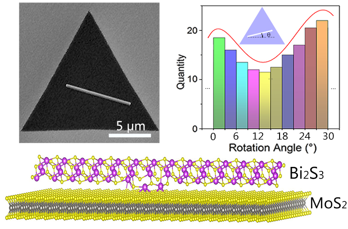 图1 共核同步生长1D-Bi2S3/2D-MoS2异质结(ACS Nano, 2016, 10 (9), 8938–8946)。