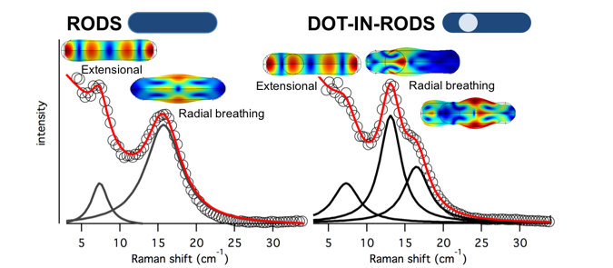 拉曼光谱是表征声子振动光谱的重要技术手段。近年来,半导体研究所半导体超晶格国家重点实验室谭平恒研究组与意大利技术所的Roman Krahne教授在中科院王宽诚率先人才计划卢嘉锡国际创新团队的支持下,利用该研究组自己发展的超低波数拉曼技术在非共振条件下对CdSe/CdS纳米点棒异质结的超低频量子受限的声学声子进行了系统的研究。他们发现该纳米点棒异质结的声学声子主要包含了伸缩模(2 cm-1~10 cm-1)和径向呼吸模(250px-1~20 cm-1),这与纳米棒的声学模式类似,但是异质结的径向呼吸模较相应尺寸纳米棒出现了明显的红移(2-3 cm-1),且红移量随着异质结中纳米点尺寸的增加而增加。有限元模拟结果表明,该红移主要是由纳米点导致的呼吸模局域化所引起的。伸缩模的非局域性使得这种红移效应明显减弱。进一步研究表明,纳米点引入的平均声速度减小是导致异质结量子点径向呼吸模红移的直接原因。在改良的Lamb理论中,引入有效声速度,可以得到声速度改变的有效体积基本与纳米点尺寸相同,更进一步验证了异质结中呼吸模振动的局域性。研究还发现,通过调控纳米点位置也可以调控呼吸模的振动频率和振幅分布等性质。对于CdSe/CdS这种I型异质结来说,其吸收主要由CdS棒来决定,而光发射局域在CdSe纳米球部位,也就是说,声学模的局域部位与光跃迁位置相同,因此这为通过调控纳米点的粒径和位置来调控纳米点棒异质结声学声子辅助的光学跃迁性质提供了可能,对研究点棒异质结的光发射性质具有重要参考意义。