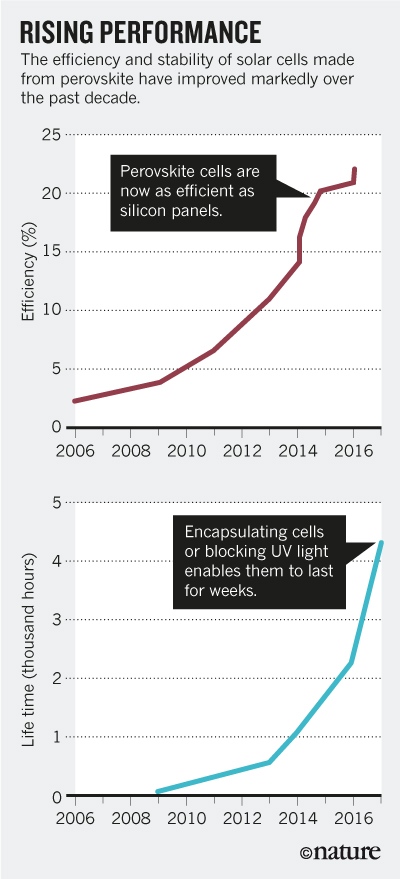 图1. (上). 过去十年钙钛矿电池发展效率的趋势图,(下).钙钛矿电池稳定性发展图。