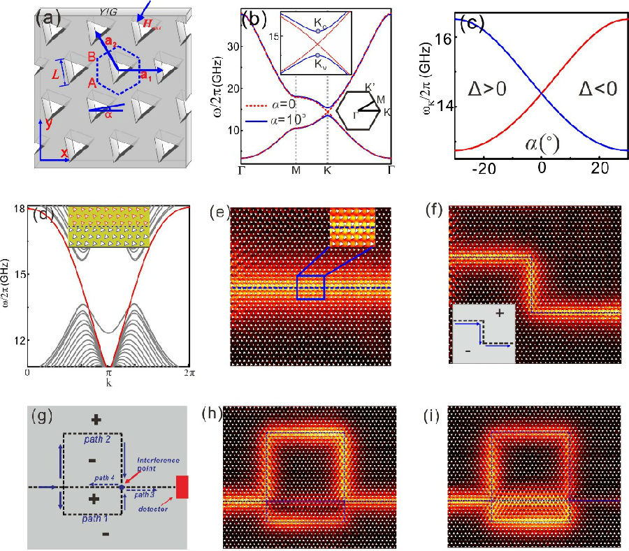 磁振子在固体中的传播无规往往不易控制。中科院半导体所超晶格国家重点实验室博士生李运美博士、常凯教授和复旦大学肖江教授合作,利用纳米刻蚀的方法在磁性绝缘体薄膜上刻蚀有转角的孔洞的三角阵列,孔洞的转角能够控制磁振子能带带隙的大小和符号,以及谷的拓扑数的符号。通过构造具有相反孔洞转角的界面,体系具有整数的拓扑数,界面上存在受拓扑保护的沿着界面传输的态。这些态表现出背散射禁戒的特点,同时在传播过程中保持很强的相干性。在构造的磁振子的马赫-曾德尔干涉仪中,通过连续改变外加磁场,能够实现磁振子信号的连续变化。干涉仪对外磁场很敏感,通过调节干涉仪臂长,能够探测到地磁场量级(约1Gs)的微弱磁场变化。