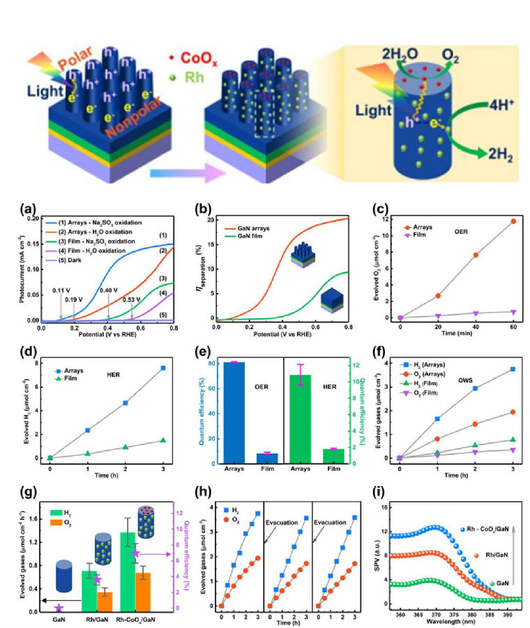 该成果以题为“Surface polarity-induced spatial charge separation boosting photocatalytic overall water splitting on GaN nanorod arrays”的Full Article,在线发表在《德国应用化学》(Angew. Chem. Int. Ed.)上。半导体所闫建昌研究员与大连化物所李灿院士、李仁贵研究员作为论文共同通讯作者,博士生张亮(照明中心,导师王军喜研究员)与博士生李政为论文共同第一作者。该研究工作得到中科院重大研究项目、中科院洁净能源先导科技专项以及国家自然科学基金委等的基金支持。