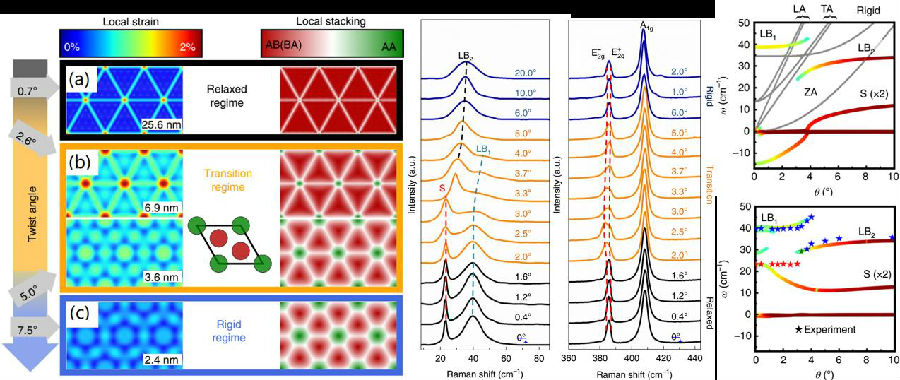 转角双层MoS2的晶格结构和拉曼光谱以及利用低能耗连续介质模型所计算布里渊区中心声子随转角改变的演变规律 (DOI: 10.1038/s41563-021-00960-1)