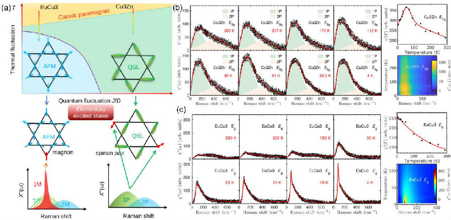 图1、(a) 反铁磁体EuCu3(OH)6Cl3和量子自旋液体体系Cu3.18Zn0.82(OH)6FBr的磁激发示意图;(b) Cu3.18Zn0.82(OH)6FBr和(c) EuCu3(OH)6Cl3随温度变化的拉曼光谱、拉曼磁化系数和拉曼响应。 (DOI: 10.1038/s41467-021-23381-9)