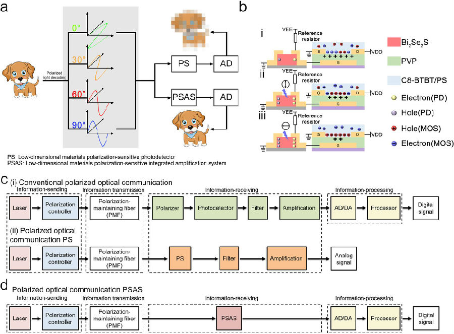 光的偏振态携带着大量无法通过光强、波长、频率和相位来获得的有效信息。利用偏振光敏感光电探测器实现对偏振光的有效检测,可以增强被检测物体的信息,显著提高目标对比度。目前,偏振敏感光电探测器广泛应用于工业、国家安全、生物诊断和天文学等多个领域,具有重要的应用价值和研究意义。然而,传统的偏振光检测系统结构复杂,需要前置偏振片光阵列外加滤波器、放大电路以及复杂的解码算法来输出数字信息。这使得偏振系统体积庞大,限制了其小型化应用的需求。近年来,低维半导体材料的兴起为高性能光探测开辟了另一条道路,采用具有面内各向异性结构的低维半导体材料在没有偏振片的情况下也能有效的探测偏振光。然而,令人遗憾的是目前基于低维半导体的偏振光探测器仍存在一些限制因素,如在环境条件下的不稳定性、光学响应范围窄、各向异性光电流比不足等,这些不利因素直接导致目前无法有效的实现数字输出。