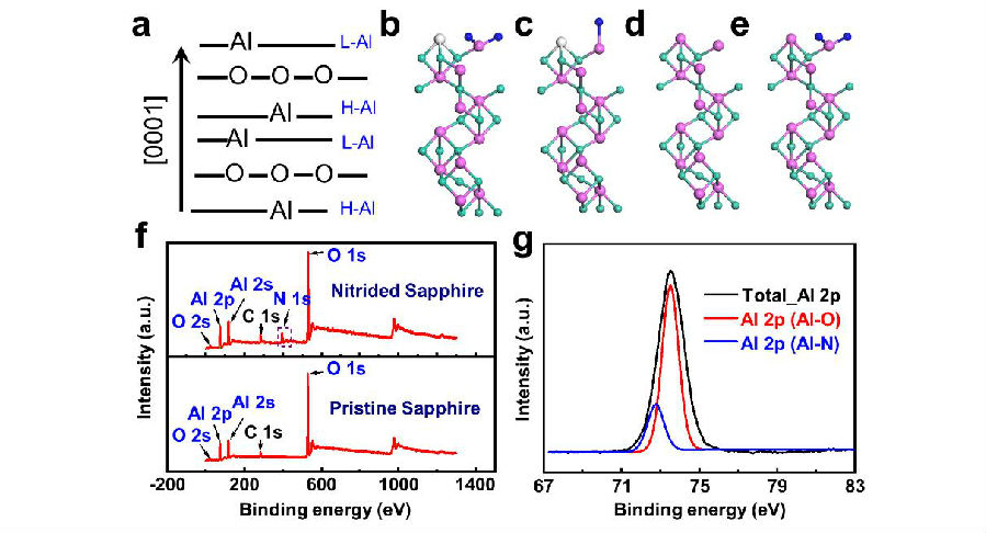 图3. 蓝宝石衬底表面并入原子的第一性原理计算。a) 蓝宝石原子排列和堆叠顺序;b) 构型1,氮原子以氮极性排列与低位铝成键;c) 构型2,氮原子以铝极性排列与低位铝成键;d) 铝原子占据高位铝原子位点;e) 氮原子与低位铝原子成键;f) 氮化前后蓝宝石表面C1s XPS光谱。g) Al2p XPS光谱的光谱表明Al-N键的形成。