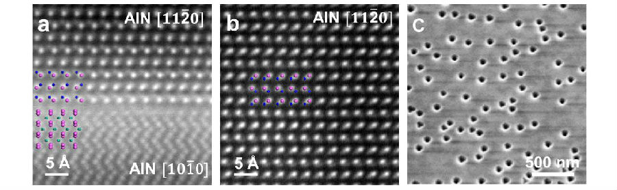 图2. AlN外延层极性表征结果。a) AlN/蓝宝石界面的HAADF-STEM图像。氮化物呈N极性;b)靠近AlN顶层表面的HAADF-STEM图像,氮化物呈Al极性;c) KOH腐蚀AlN表面的形貌,六边形的V形坑表明表面呈金属极性。