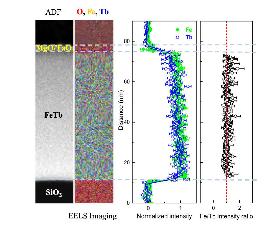 图1.扫描透射电镜(STEM)图像及元素能量损失谱,从中可以清楚地看到FeTb是界面平整、组分均匀的非晶薄膜。