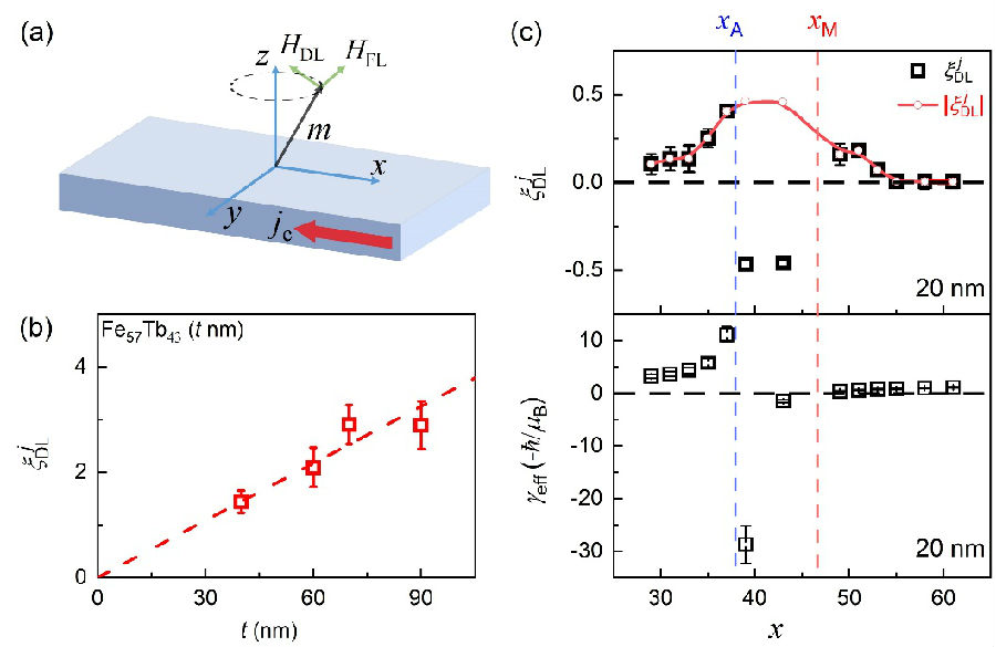 图2. (a) 单层膜中体自旋轨道矩示意图;(b) 体自旋轨道矩效率随厚度增加而增加,且在较大厚度时达到了300%;(c) 20 纳米薄膜中自旋轨道矩效率和有效旋磁比对Tb组分的强烈依赖关系。中间组分的反号行为表明该新型自旋轨道矩依赖于体系角动量和磁矩的相对取向。