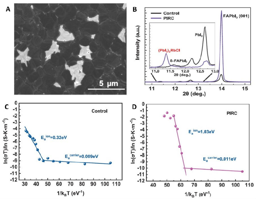 图1 (A)具有PIRC二次相钙钛矿的扫描电子显微镜照片,(B)有无PIRC的钙钛矿薄膜X射线衍射图谱(插图为局部放大图),(C)与(D)分别为有无PIRC的钙钛矿电导与温度关系图。