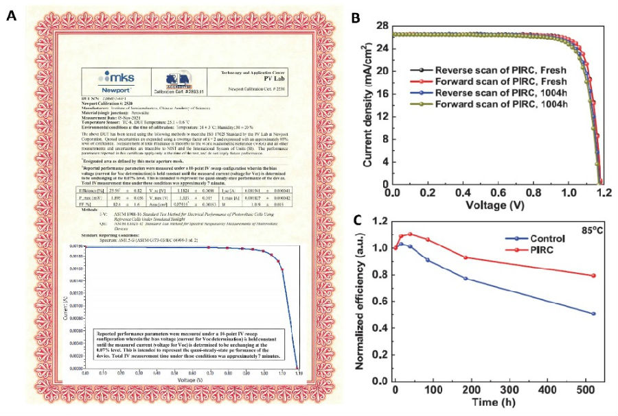 图2 (A)第三方权威机构美国Newport认证书,认证效率为25.6%,插图为认证效率曲线,(B)有无稳定二次相PIRC器件放置的电流-电压曲线,(C)有无稳定二次相PIRC器件在85oC加速老化下的稳定性。