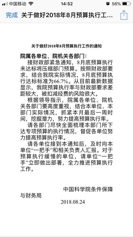 接中科院条件保障与财务局通知:财政部紧急通知,8月底预算执行未达标将压缩部门预算。按照财政部要求,我院8月底预算执行标准要求为66.7%,而我所7月底预算执行率为54.44%。从目前数据显示,我所预算执行率与财政部要求差距较大,有被扣减经费的风险。
