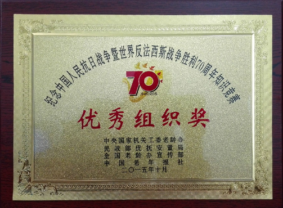 近日,我所获得由中央国家机关工委老龄办、民政部优抚安置局、全国老龄办宣传部及中国老年报社颁发的“纪念中国人民抗日战争暨世界反法西斯战争胜利70周年知识竞赛优秀组织奖”。