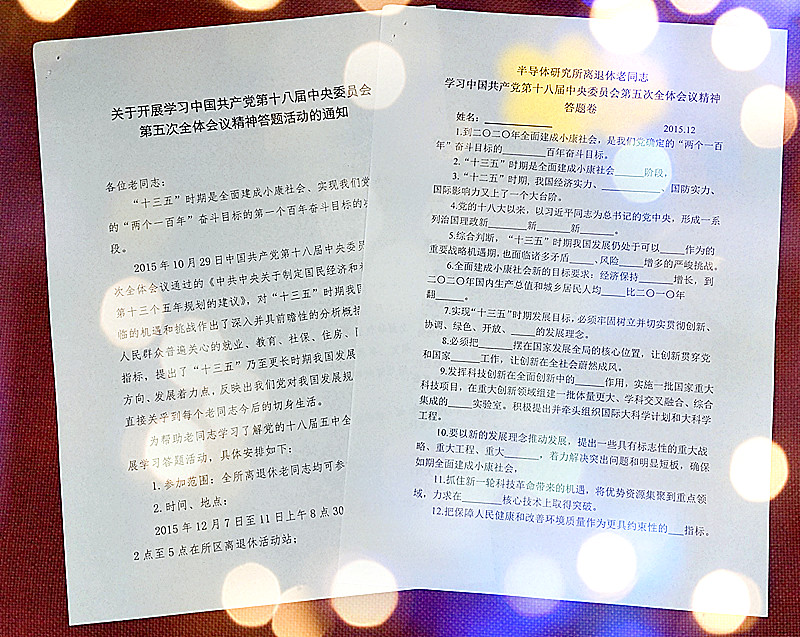 离退办和党支部结合中央十三五建议,编拟了20个学习题,主题是大家关心的创新发展和老龄化及养老等。