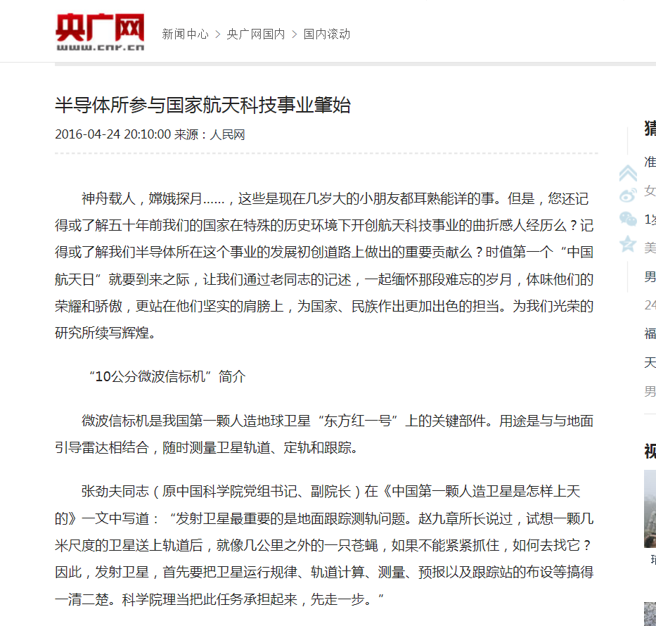 近日,我所老同志的工作记述《半导体所参与国家航天科技事业肇始——我所参与开创国家航天事业的一段故事》被人民网登载(http://politics.people.com.cn/n1/2016/0423/c1001-28298985.html)和央广网、中青网等转载。