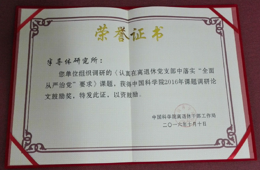 2016年10月20日,中国科学院离退休干部工作研究会召开第六届三次理事会。会议对部分离退休工作研讨文章进行了表彰。我所提交的离退休工作调研文章《认真在离退休党支部中落实“全面从严治党”要求》,获得“中国科学院2016年课题调研论文鼓励奖”。