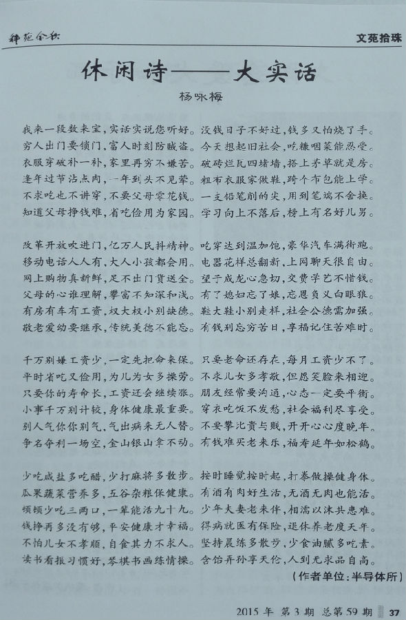 在近日出版的院离退休工作刊物《科苑金秋》上,刊登了我所退休老同志杨咏梅的诗文《休闲诗——大实话》。到底说了什么,是不是实话,请大家往下看。