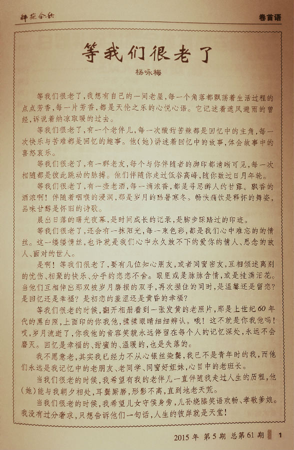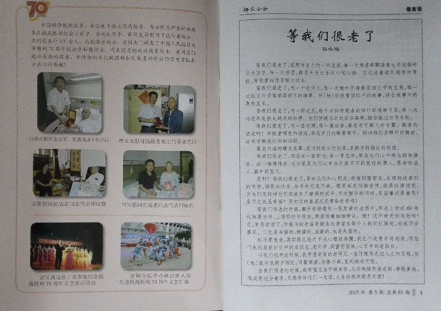 最近一期的院离退休工作专物《科苑金秋》(2015年第五期),卷首语采用了我所退休老同志杨咏梅的文章《等我们很老了》。