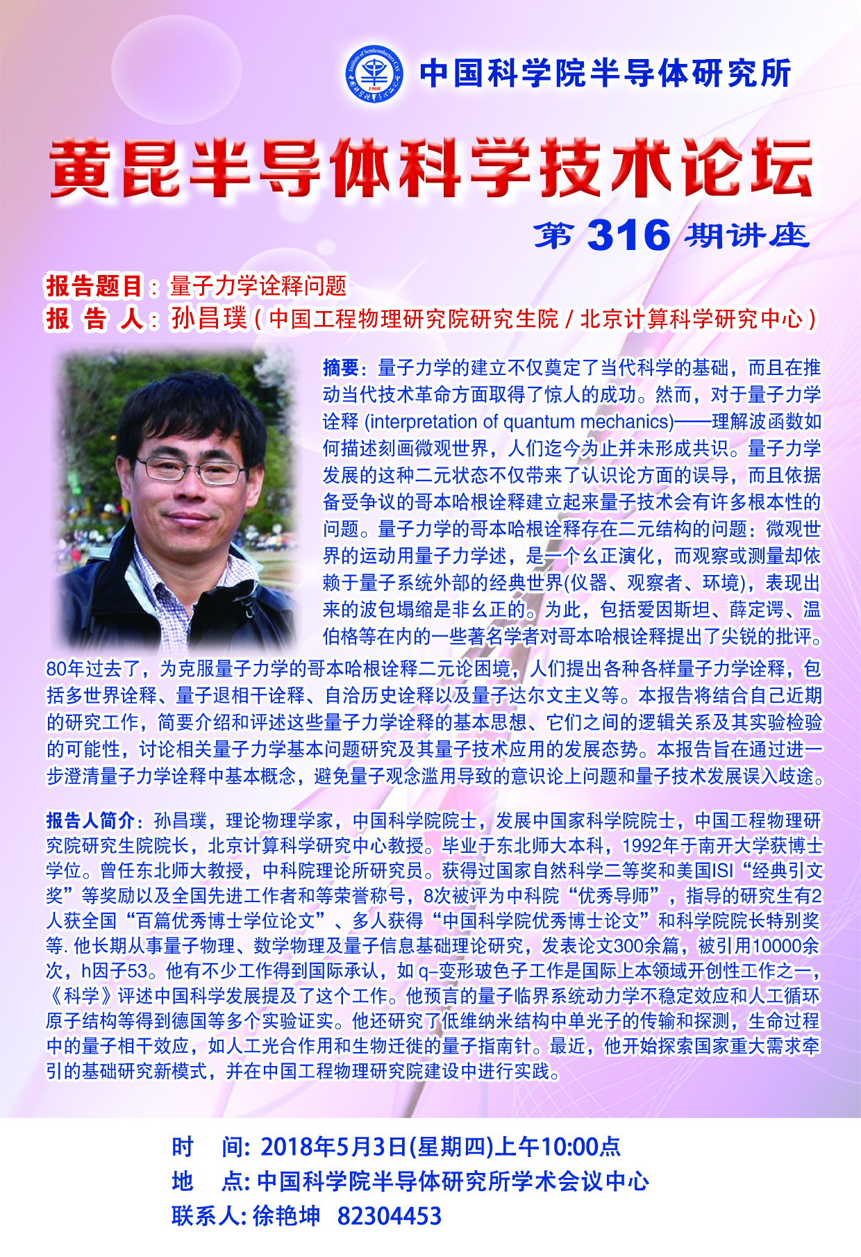 孙昌璞教授将于2018年5月3日来所交流并在黄昆半导体科学技术论坛上作第316期报告。