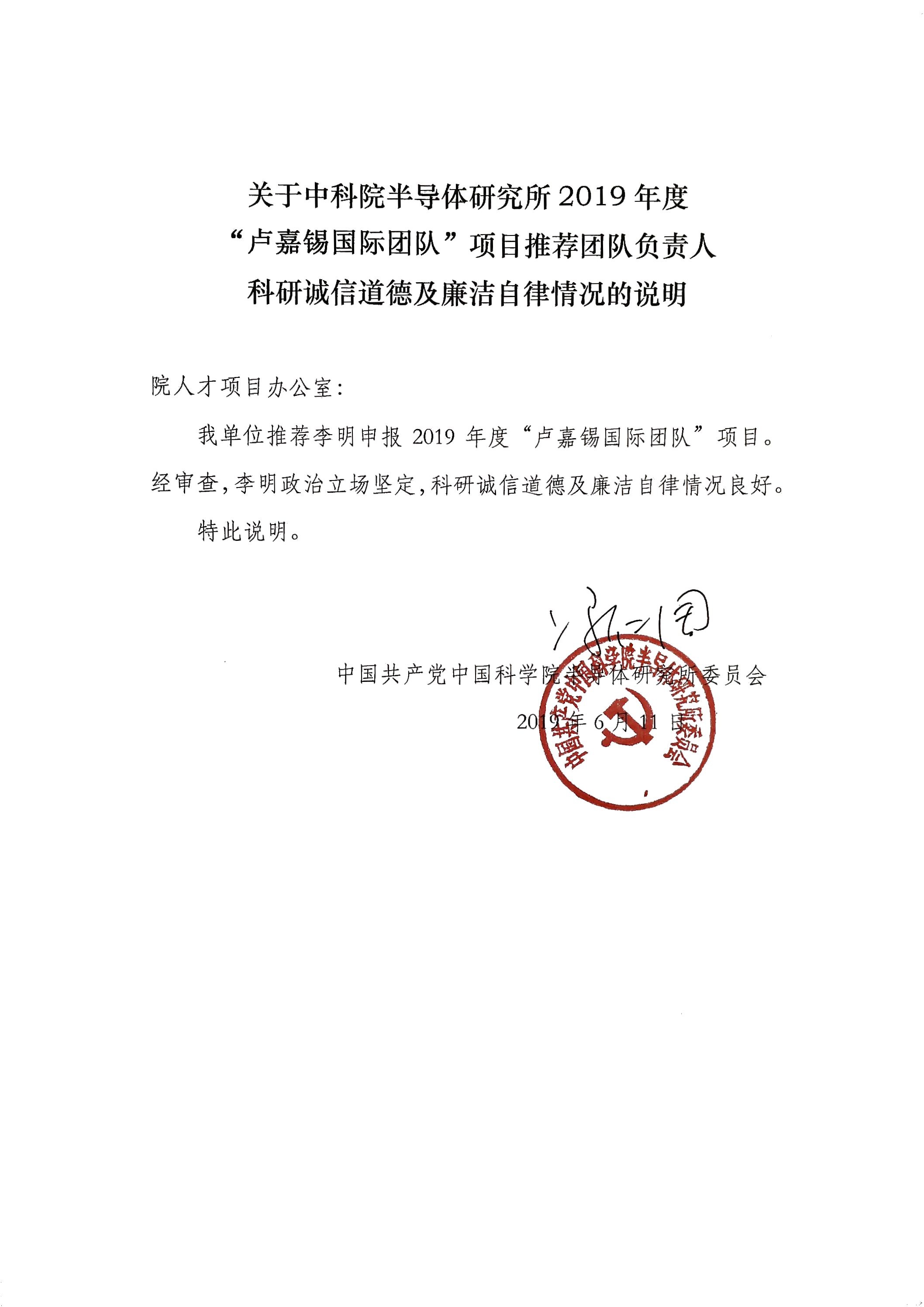 依照《2019年度中国科学院人才项目申报指南》要求,经部门推荐,研究所研究,决定拟推荐“微波光子集成”团队申报2019年度卢嘉锡国际团队项目。现将团队信息及团队负责人政治立场、科研诚信及廉洁自律情况的说明进行公示,公示期为2019年6月12日—14日。