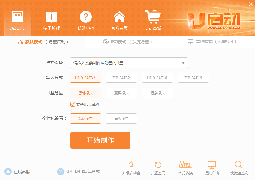 (2)启动软件如下图,插入U盘,点击开始制作,系统会自动制作U盘启动盘。3、利用U盘PE系统启动计算机,将需要格式化的硬盘和U盘插到计算机上。