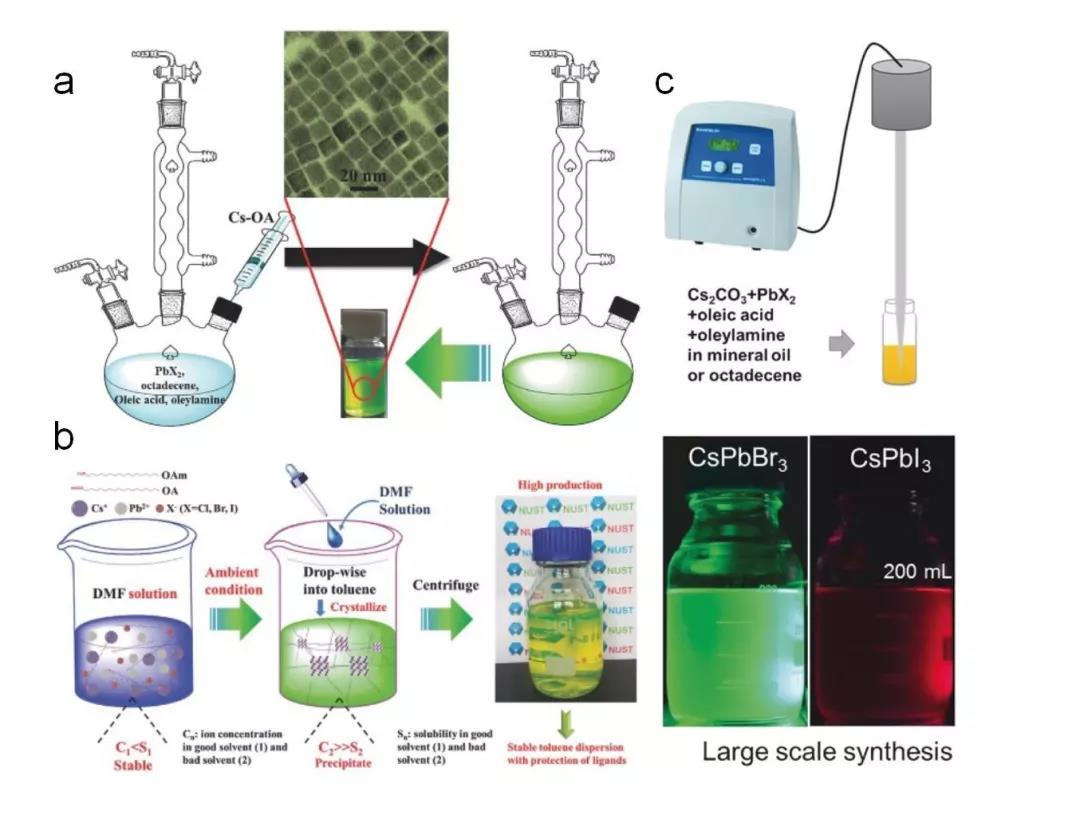 作为近年来最热门的明星材料之一,钙钛矿材料成功吸粉无数,相关应用研究在多种领域内开花结果。因具有较窄的发射光谱、可调的光学带隙、较高的发光量子效率及可溶液加工性能等独特优势,钙钛矿纳米晶在太阳能电池及发光显示等领域均具有巨大的发展潜力。特别地,全无机钙钛矿纳米晶由于其较好的光电特性自2015年首次报道以来,目前已在光电子器件领域展现出巨大的应用潜力。